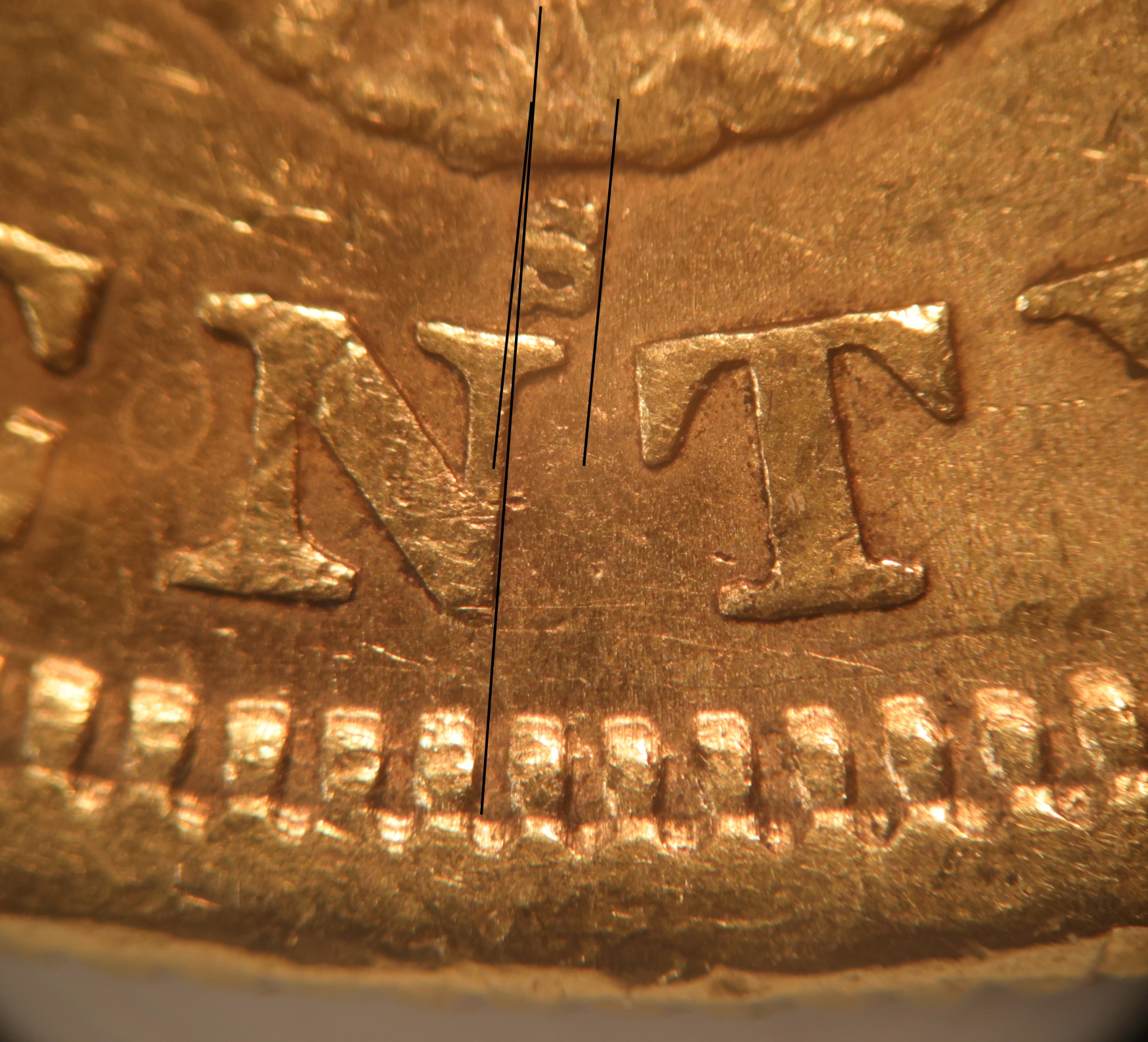 S Mint mark tilted slightly right. Left side of mint mark lines up with right side of right upright in N.