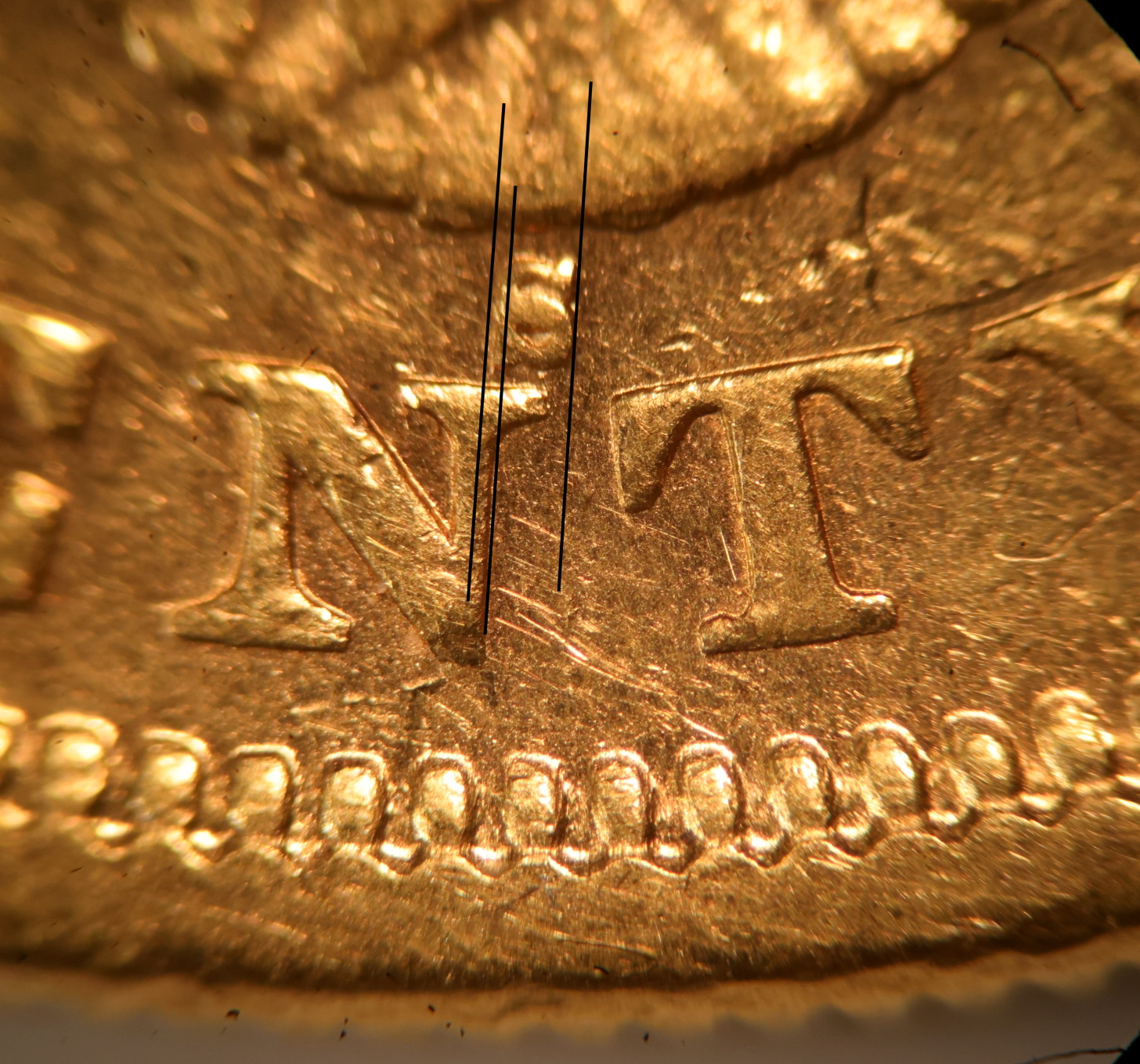 S Mint mark tilted slightly right. Left side of S over the center of right upright of N.