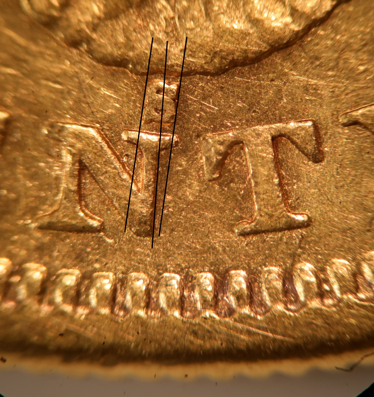 S Mint mark tilted slightly right, positioned over right upright of N.