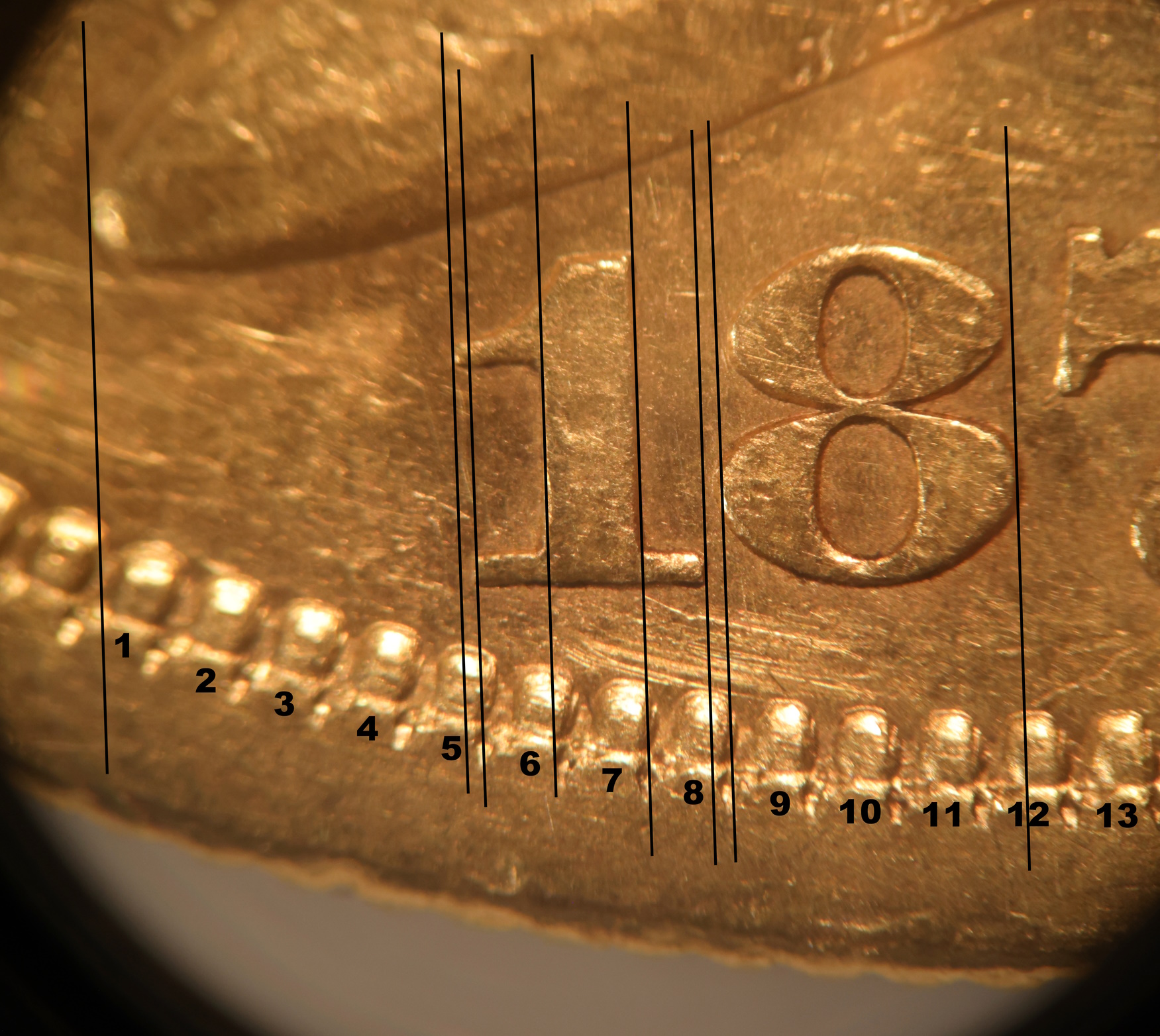 Date is pretty well centered both up and down, and left to right. 8 Centered under the dot following the J.