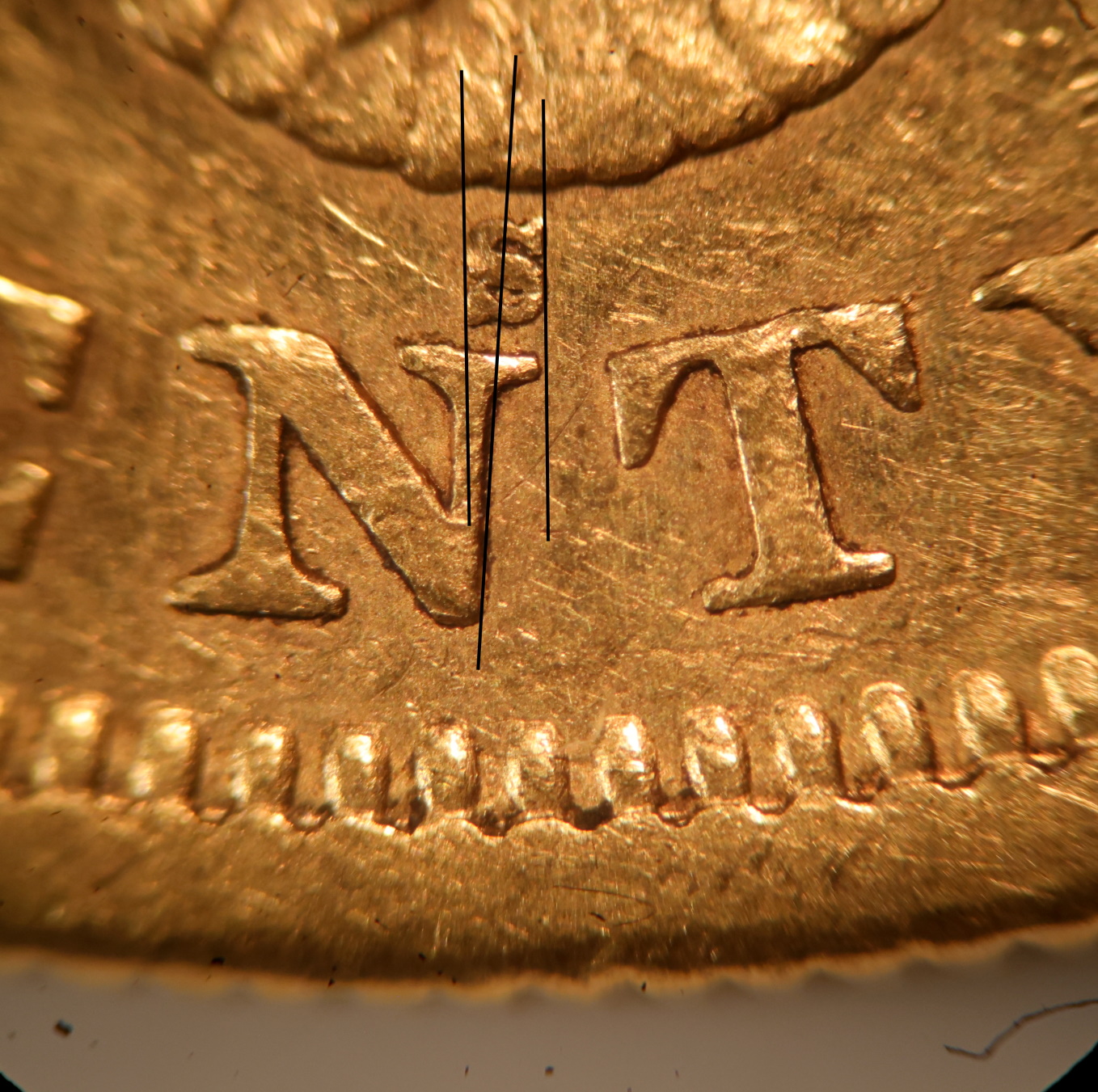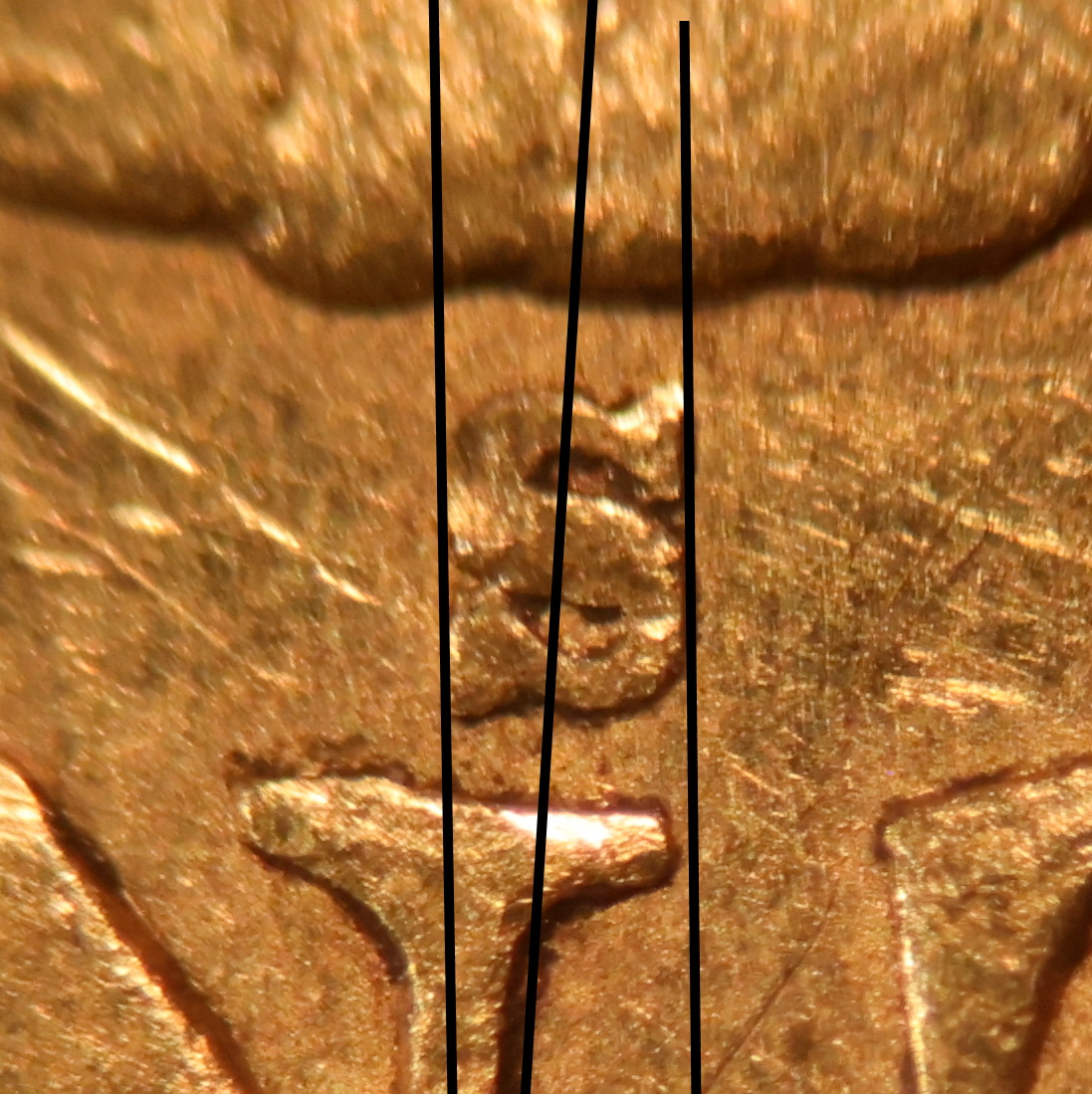 Clear S mint mark. Left side of S over the center of the right upright of the N.